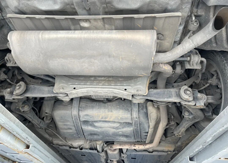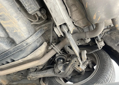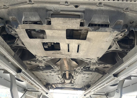 Raise the car to look at the chassis, as shown in the following picture. The bottom of the engine and gearbox are equipped with aluminum alloy lower protective plates, and the reserved holes are oil drain holes and oil change filter holes. There are no signs of oil leakage at the bottom of the engine and gearbox. The middle part of the chassis is protected by a plastic protective plate, and there are no obvious scratches.