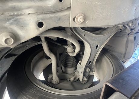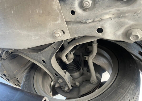 Looking at the left front suspension, the lower arm is welded from double-layer stamped steel plates. Upon inspection of the ball joint and rubber sleeve of the lower arm, there are no issues except for the damaged rubber sleeve of the steering outer rod ball joint. However, the internal ball joint is not loose and can continue to be used, while the other components are fine.