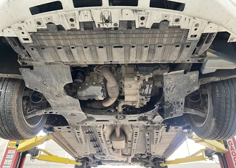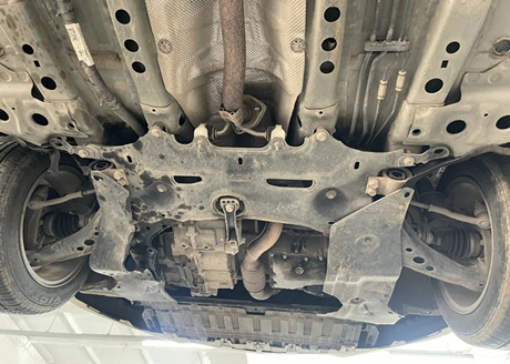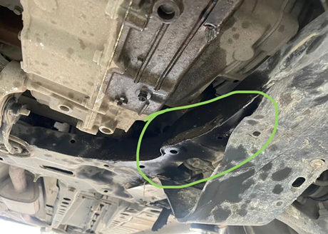 As shown in the figure below, there are no protective plates at the bottom of the engine and gearbox, only small plastic protective plates on both sides. The front part of the plastic protective plate on the right side has been scraped off, and there is a lot of oil stains on the bottom of the gearbox and the subframe on this side.
