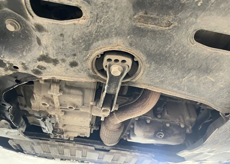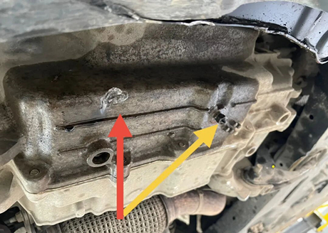 After a collision with the chassis, the car owner discovered oil leakage at the bottom of the gearbox. They quickly called the technician's rescue hotline and towed the car back. The oil seeping from the bottom was blown by the wind to the rear of the gearbox and the subframe. The yellow arrow indicates the oil drain screw of the gearbox. The technician said they have encountered a situation where this screw leaked oil after being touched before.