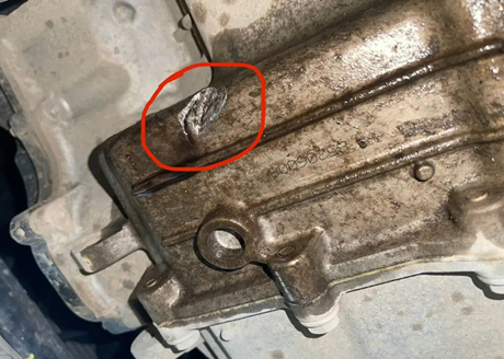 The master said that these gearbox oils are all flowing out from the bottom of the gearbox, as shown by the red arrow in the picture below. This position at the bottom of the gearbox has been scratched and bumped, and due to the deep scratches and aluminum alloy material, cracks and oil leakage have appeared.