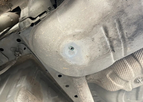 Look at the bottom of the fuel tank, there is a heat insulation tile between it and the exhaust pipe, and this position is also deformed.
