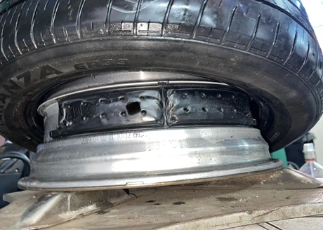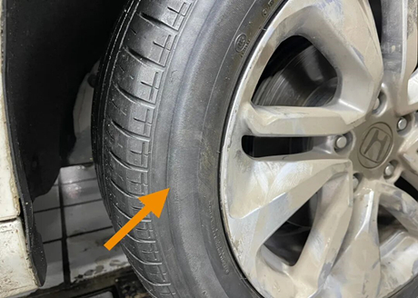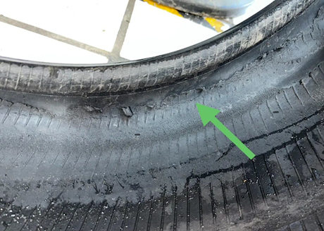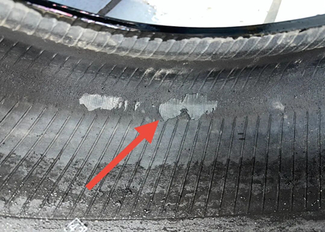 When the master was loosening the tire screws, he found a clear crushing mark on the tire sidewall and asked the owner: Did you drive a certain distance with the tire flat? We can see from the arrow that the side of the tire has already been dented, which is caused by driving when the tire is completely deflated.