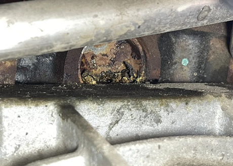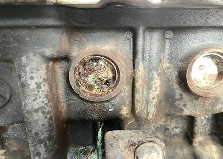 Among the three water blockages on this side of the intake manifold, two are particularly leaking and the other is severely rusted.