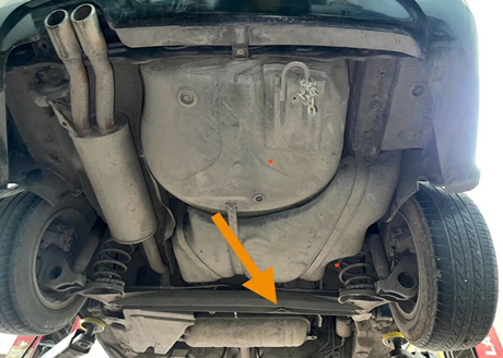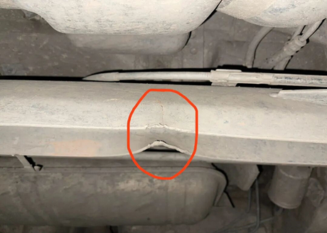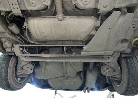 The rear suspension is a torsion beam non independent suspension, and the fuel tank is designed at the rear of the suspension. Nowadays, few cars design the fuel tank at the rear of the rear suspension. If there is a rear end collision, the fuel tank is easily squeezed. There is a problem with the rear suspension now, as indicated by the arrow in the figure below, which has undergone deformation.